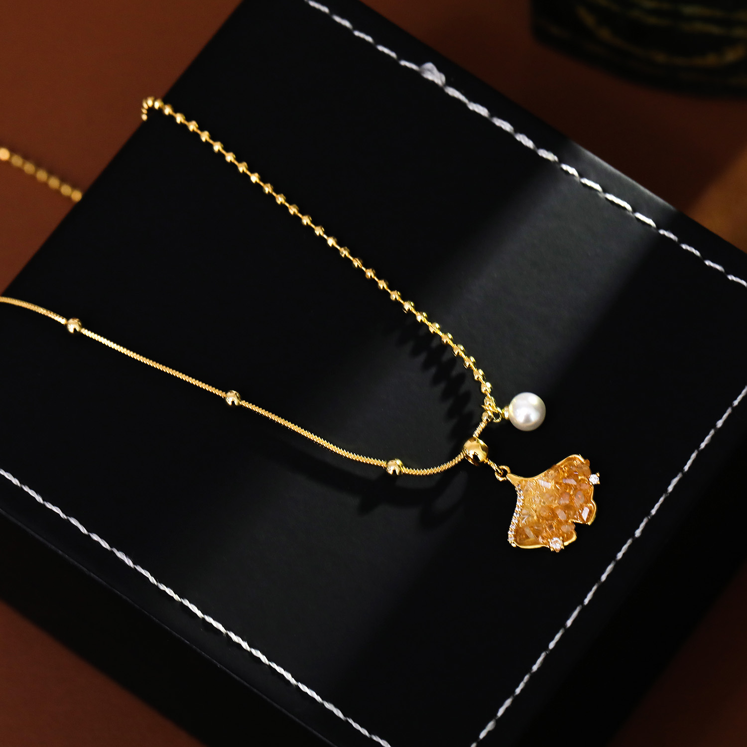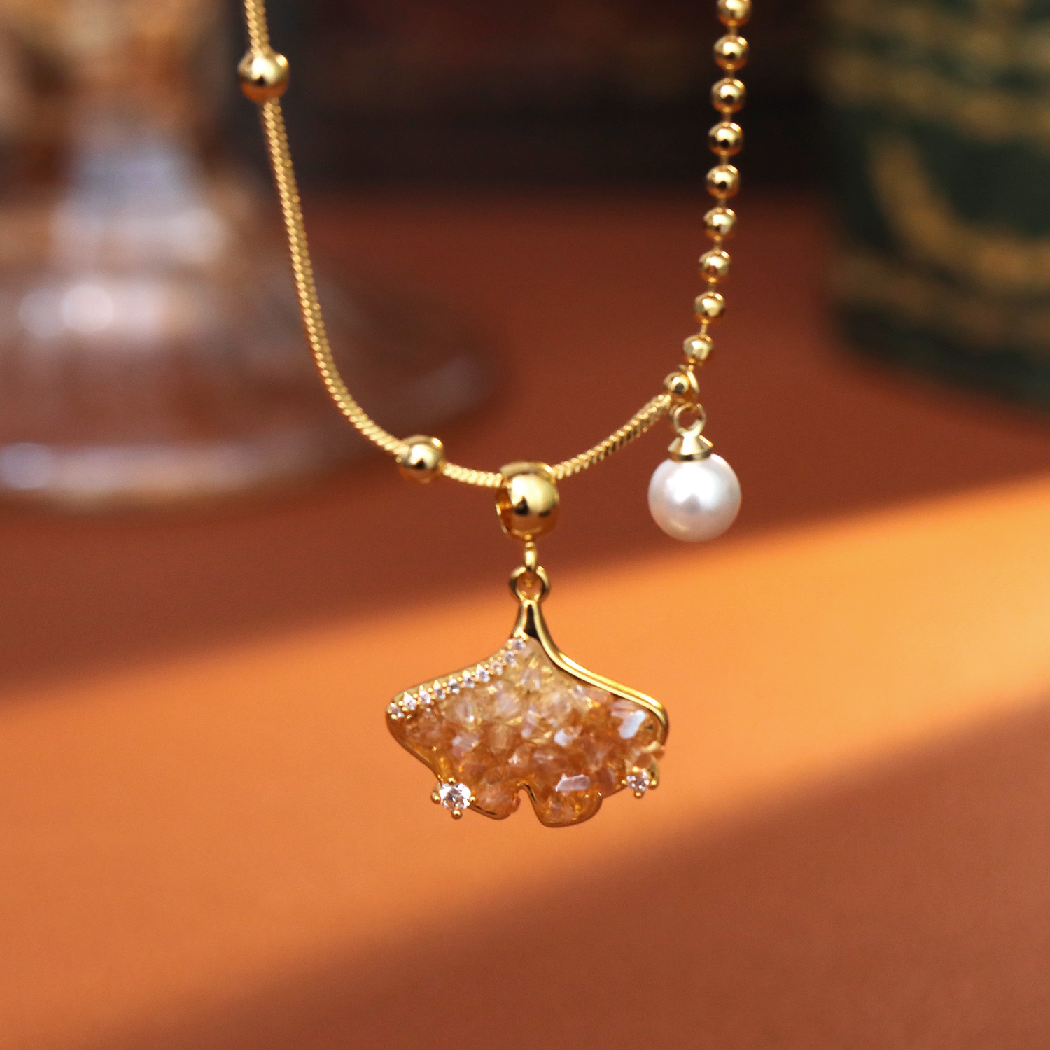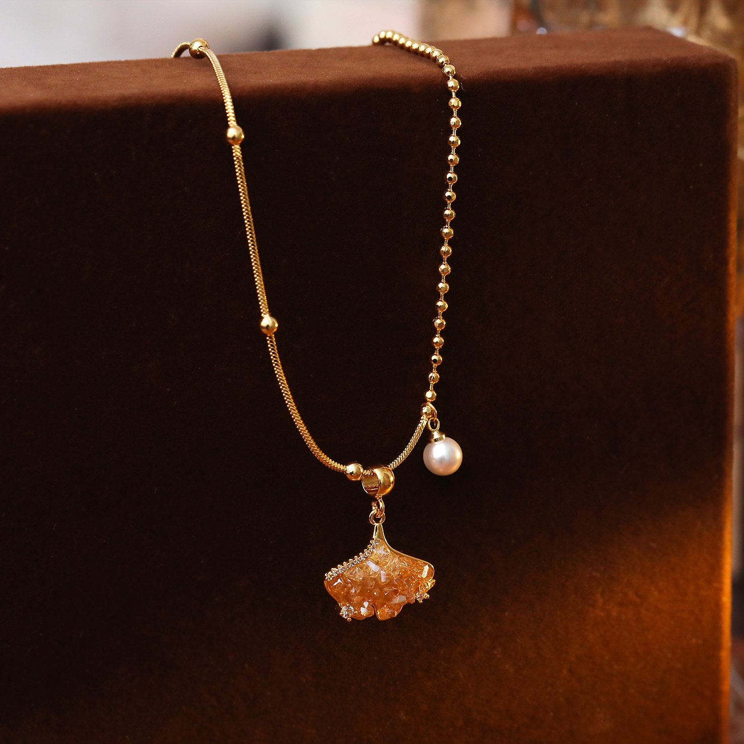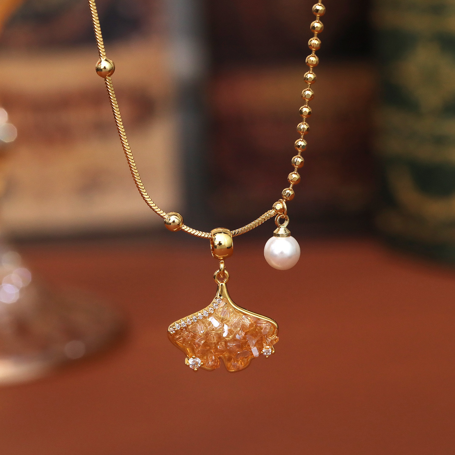 Colar de cristal, cobre, with cristal & Concha de resina, with 5.5cm extender chain, Folha, 18K banhado a ouro, joias de moda & micro pavimento em zircônia cúbica & para mulher, The pendant is 1.8cm long and 2.4cm wide. Pearl 6mm, comprimento 43.5 cm, vendido por PC