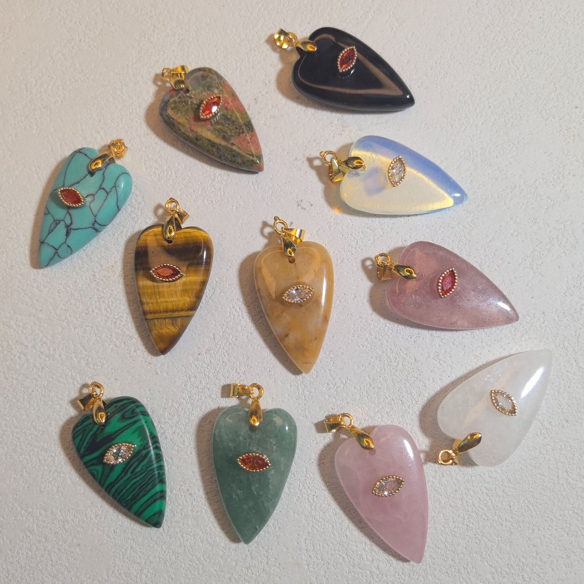 1:Quartzo Rosa2:Quartzo claro3:Quartzo de morango4:Jade amarelo5:Tiger eye6:Protein (synthetic)7:Green strawberry crystal8:Malachite9:Unakite10:luz azul turquesa11:Green aventurine12:Obsidian