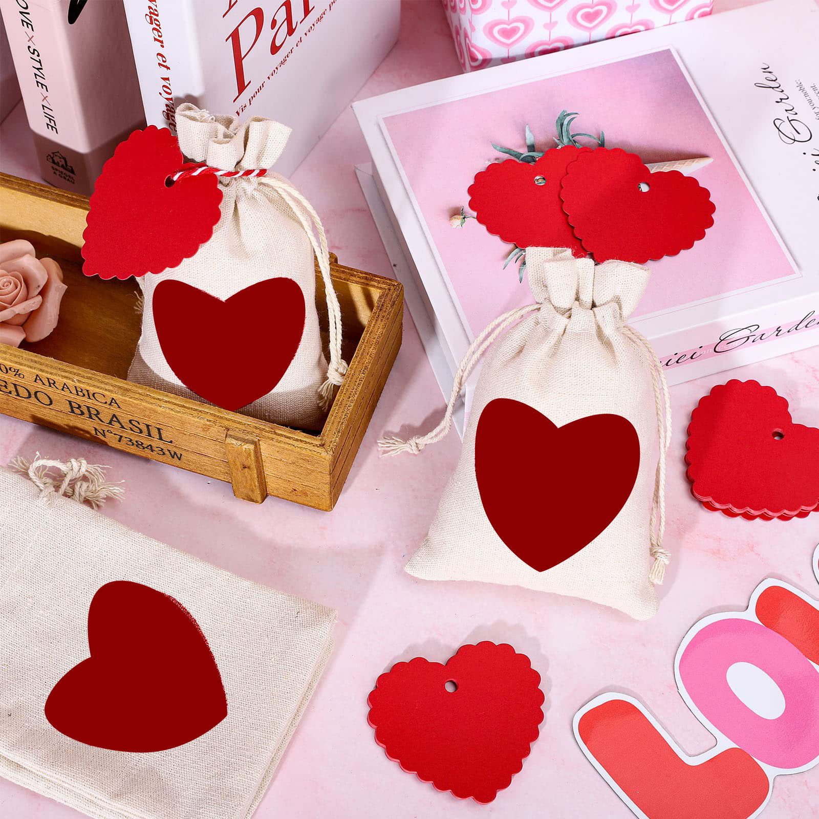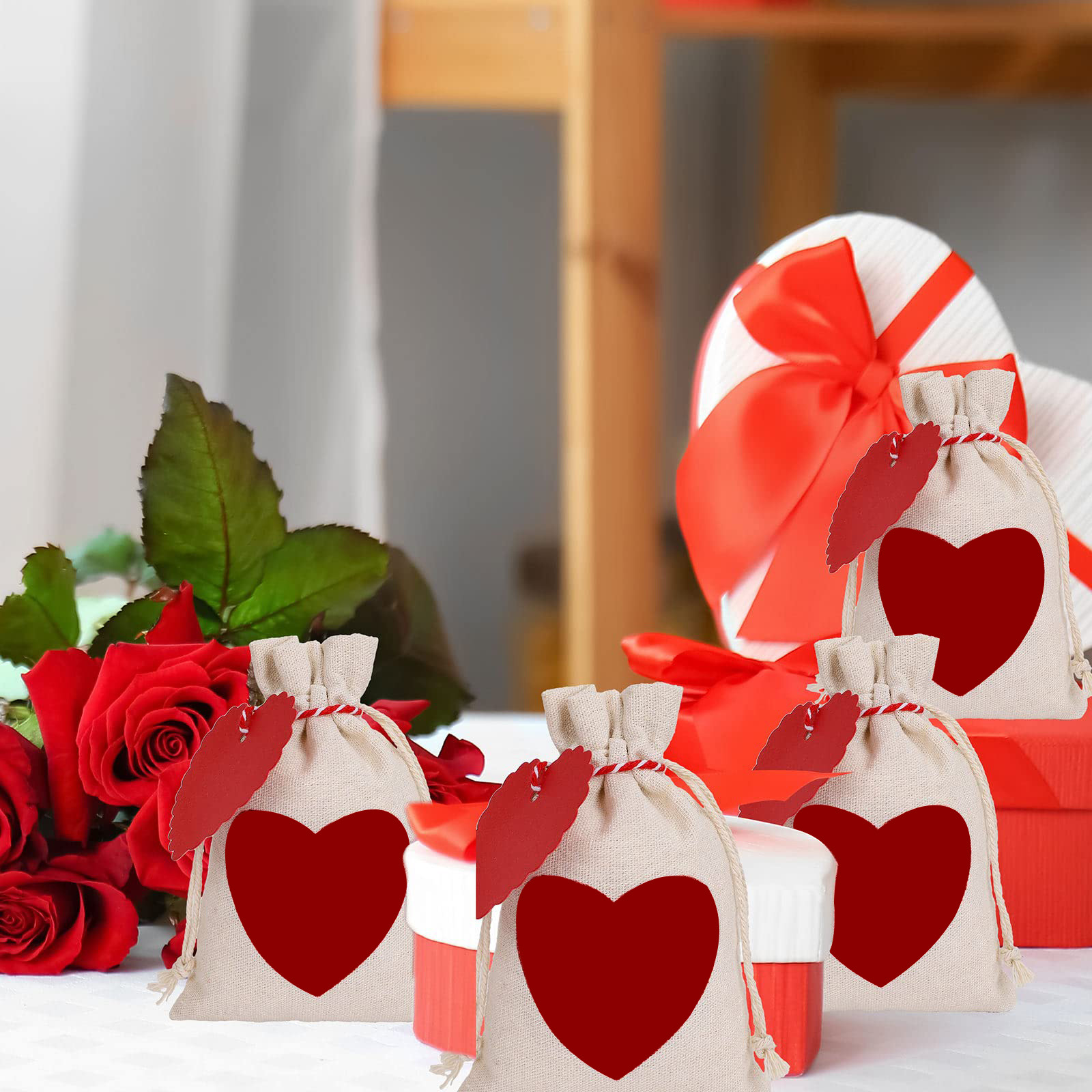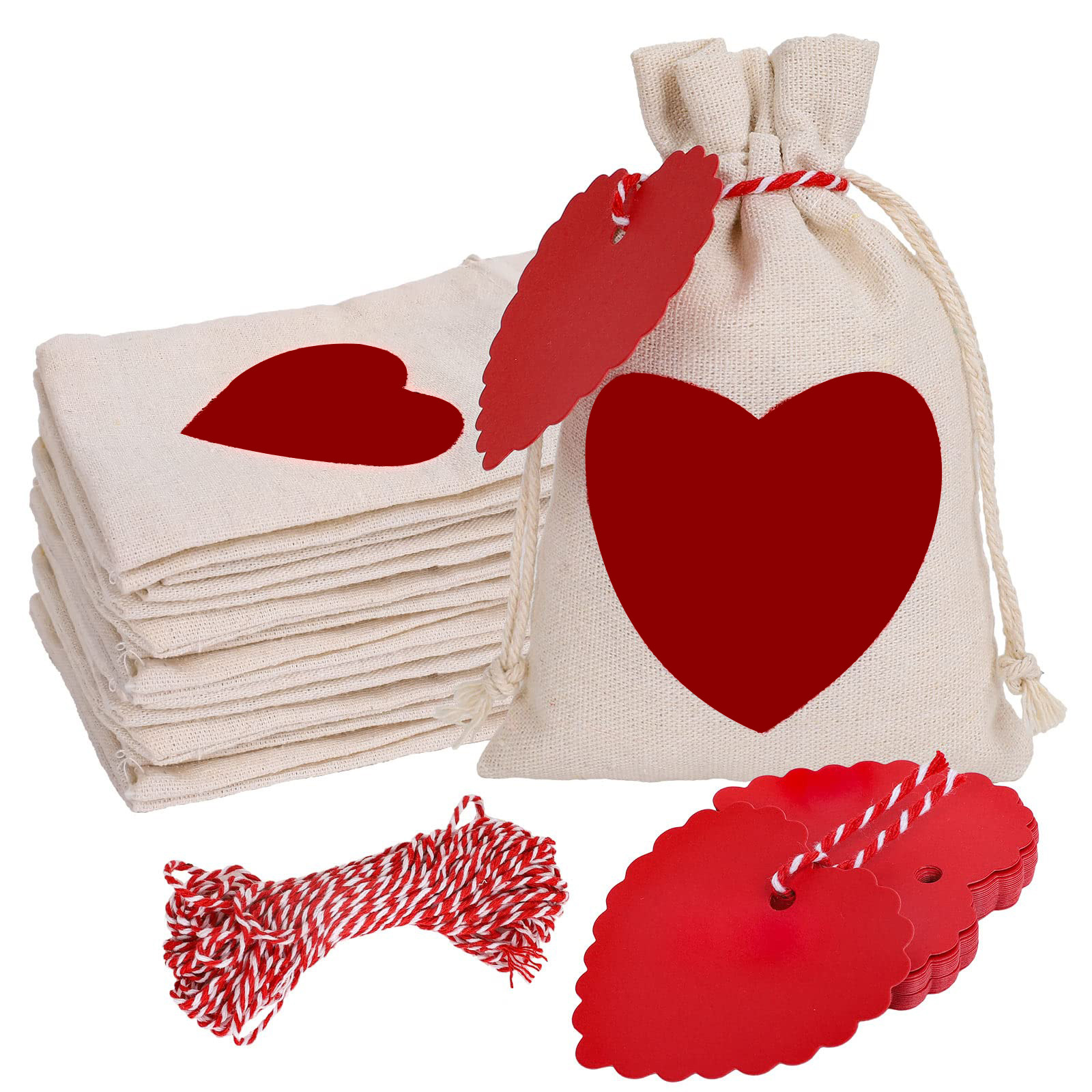 algodão Saco de cordão, Retângulo, impressão, com padrão de coração, 100x150mm, 20PCs/Defina, vendido por Defina