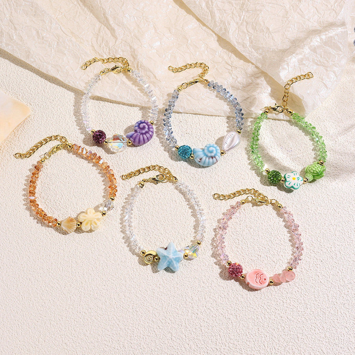 1:S2504-11 purple conch bracelet2:S2504-12 blue conch bracelet3:S2504-13 pink fish bracelet4:S2504-14 blue starfish bracelet5:S2504-15 green turtle bracelet6:S2504- 16m white flower bracelet