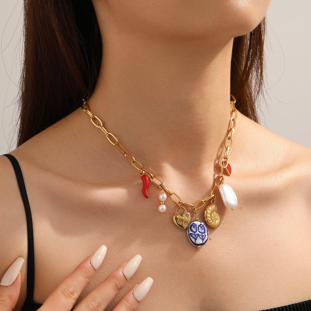 Stainless Steel smycken halsband, 304 rostfritt stål, med Porslin & Plast Pearl, plated, mode smycken & för kvinna & emalj, gyllene, Säljs av PC